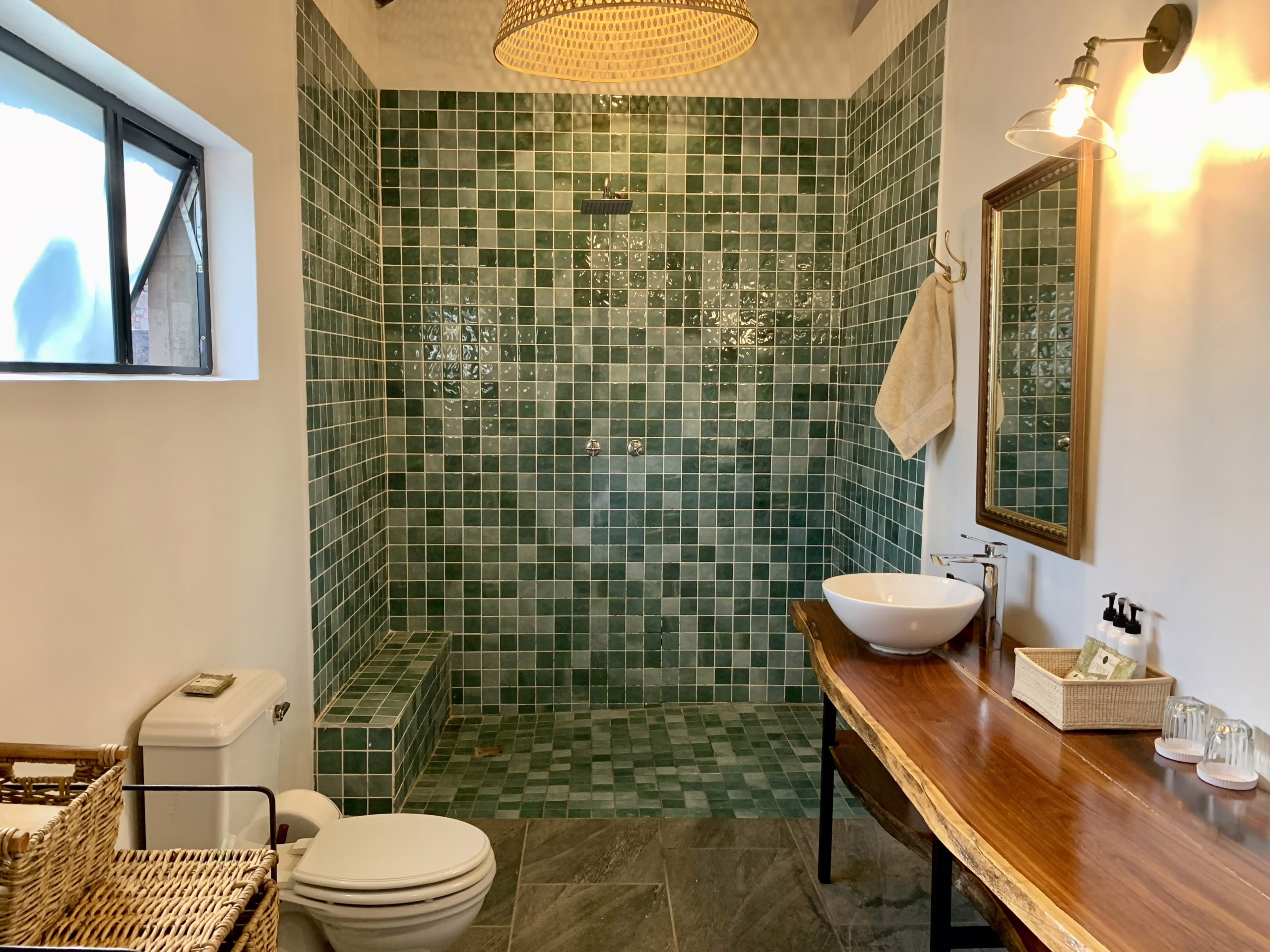 En-suite bathroom with shower, toilet, basin, and complimentary soaps